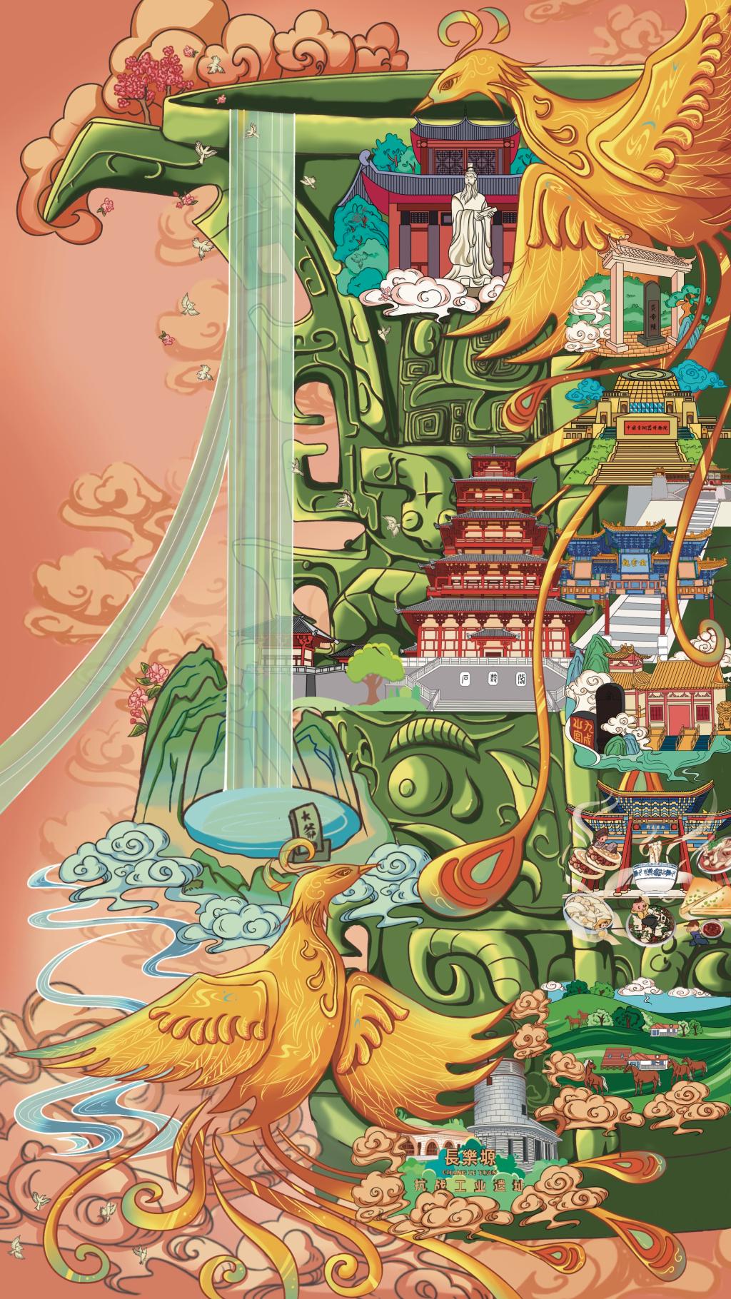 此次设计主题为“看中国 来宝鸡 畅游美丽宝鸡 共享幸福生活”,公司best365中国官方网站张海霞老师指导2022级研究生郑玉微,2021级研究生周静、金阳,以国风绘画方式创作宝鸡旅游美景,绘画中涉及宝鸡青铜器博物馆、石鼓阁、西府老街、炎帝陵、周公庙、太白山、关山草原、 长乐塬、金台观等多项承载文化意义的地域标志性建筑,其创作理念是将宝鸡文化特色景点进行融合,同时又具备历史积淀和当代价值主题,更是一种文化载体,呈现的不只是宝鸡的旅游美景,也是新时代“宝鸡”的标签,彰显了城市特色。