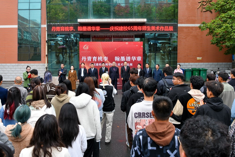 10月11日下午,“丹青育桃李 翰墨谱华章”——庆祝建校65周年师生美术作品展在高新校区开幕。公司党委书记赵健、董事长郭霄鹏出席开幕式。副董事长韩干校主持开幕式。