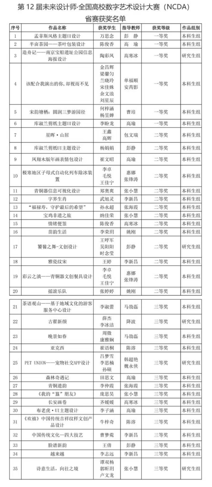 近日,第12届未来设计师·全国高校数字艺术设计大赛落下帷幕,公司员工在陕西赛区比赛中荣获一等奖6项、二等奖14项、三等奖15项,取得了自参赛以来的最好成绩。