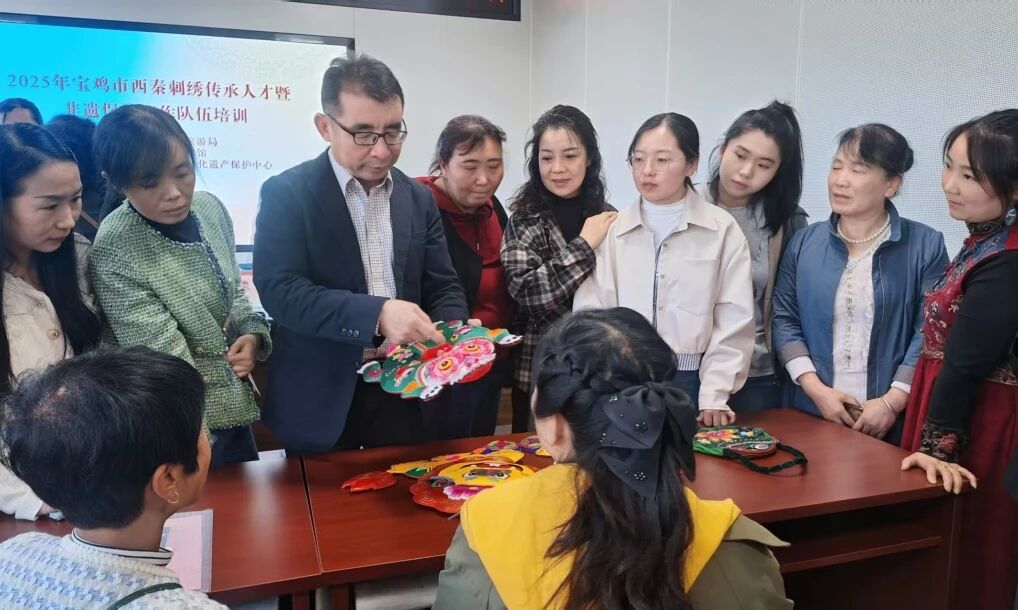 10月13日下午,2025年宝鸡市西秦刺绣传承人才暨非遗保护工作队伍培训班在千阳文化馆开班,李强经理为学员们讲授了《西秦刺绣的传承与创新》,他从西秦刺绣的历史渊源、文化内涵入手,深入剖析了在当今时代背景下如何对其进行有效的传承与创新。来自全市各县区的40余名西秦刺绣传承人及文化馆非遗专干参加了培训。